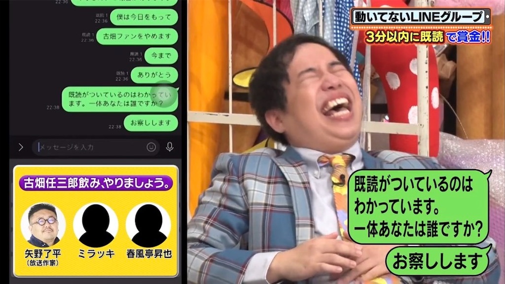 動いてないLINEグループに投稿して既読がつくか否かのチャレンジ企画。過去の投稿も「桐島かっ!?」というリアルタイム投稿も面白すぎた華丸、せいやの入ってる古畑LINEグループに突然のミラッキさん煽り→ファンやめます宣言→ヒコロヒーの怖い写真、など30分ずっと最高だった。職場の昼休みに笑い堪えながら観るんじゃなくて家で大笑いしながら観たかった。
