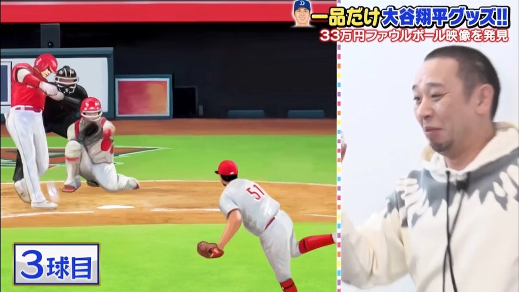 大谷が4回投げたボールは330万円・2回投げたのは169万円と超高額。結局大悟が買ったのは33万円のファウルボール!w バットの跡がなく本物かどうかわからなかったが、証明書を元に実際の映像と照らし合わせるとマジの自打球だと判明!!最後には「これで野球したいんじゃ」を発案する大悟w