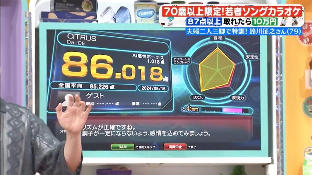70歳以上が若者ソングで87点取れるか企画。79歳男性がCITRUS歌ってたけどあの高音とリズムを歌いこなしてたの凄かった。これは超えててもおかしくなかったけどダメかー。