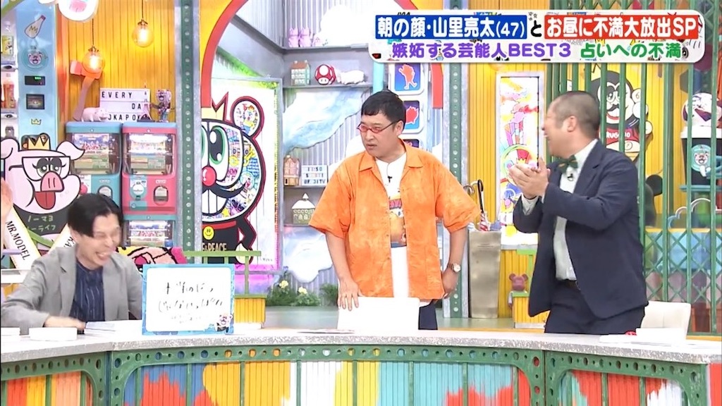 岩井からの「可愛がってる後輩が売れるより嫌いな先輩が消える方が嬉しいっぽい」にはマル。後輩が売れるのに比べれば恨んでる奴が消える方が50倍楽しい、とか、嫌な奴には直接文句を言う岩井やバカリズムの戦い方は侍なのに対して山里は山賊、とか、三色ショッピングで勝っても負けてもリアクションしないモデルは井森美幸の爪の垢をスムージーにして飲めよ、とか、THE・山里な面を出してスタジオを盛り上げていく。嫌われたくない!と言いながらもイキイキしてることに触れられると「俺ビックリしてる、まさか俺ぽかぽかがホームだったなんて」と。まあ場はだいぶ盛り上がってるけど見たことあるムーブばっかだなと思ってたら、