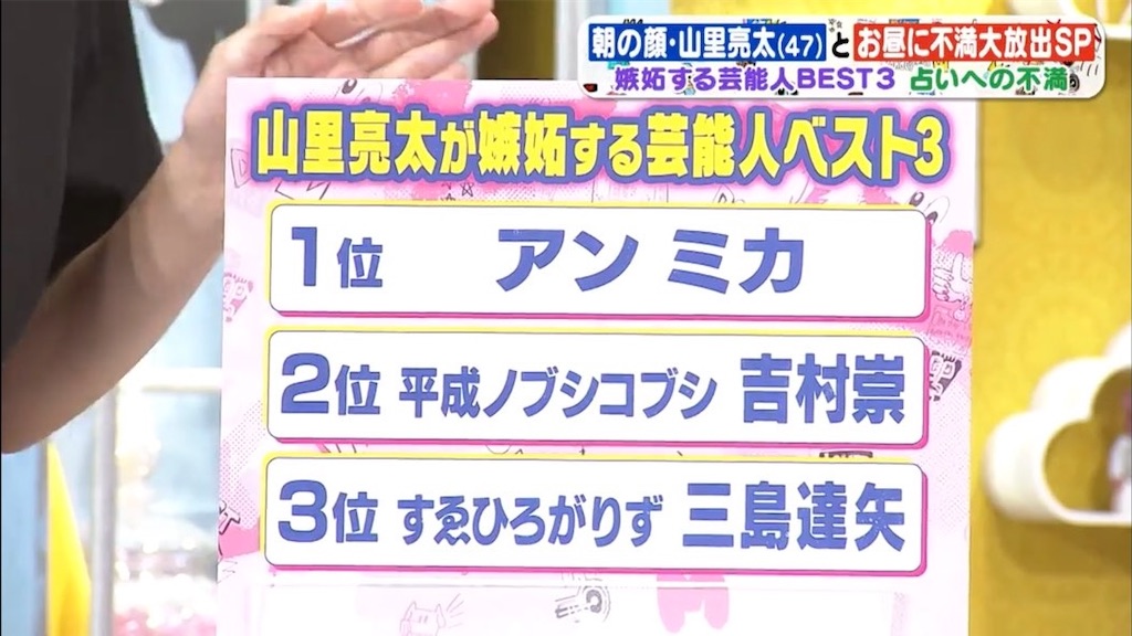 山ちゃんが嫉妬する芸能人ベスト3はすゑひろがりず三島・ノブコブ吉村・アンミカ。そんなわけねえだろと思ったら岩井がフリップで「このランキング本当のやつじゃないっぽい」を即突っ込む。澤部もアンミカを1位にしてるあたりがおかしいと疑う。