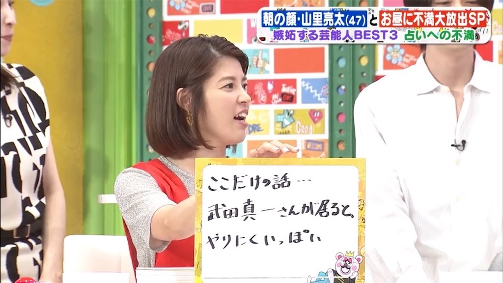 神田さんから「ここだけの話(DayDay.で)武田真一さんが居るとやりにくいっぽい」が出るとそれまでマルばっかだった山ちゃんも流石にバツw