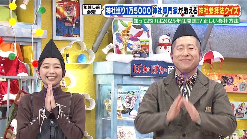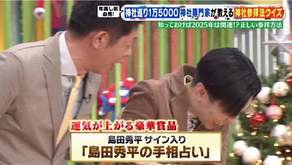 後半は島田秀平とブレーンの佐々木優太開運神社SP。神社参拝クイズの商品は島田の著書、いらない的なムーブを全員でかます中、岩井は1人「犯罪者」と行きすぎたガヤを入れ捕まえられるw