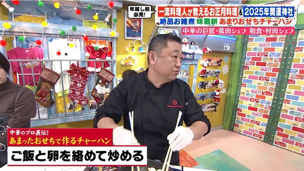 前半は中華の菰田欣也シェフ・和食の村田明彦シェフを迎えて正月料理SP。余ったおせちでチャーハンチャーハン。米を卵と炒める時は菜箸を両手で使った方がいいと菰田シェフ、要所要所でボケたがる感じがあり、会心のヒットがなかなか出ない中での唐突な「公表してないんですけどね、お父さんカニなんですよ」の一言でスタジオが湧くww