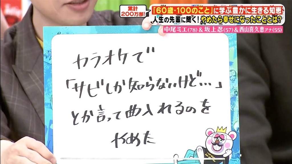 ◆3月14日(金)ゲスト・中尾ミエ&坂上忍&西山喜久恵アナウンサー◆ベストセラー「60歳・100のこと」シリーズを受けて『人生の先輩に聞く これをやめたら幸せになったSP』、ゲストは78歳・57歳・55歳で60歳以上限定の街録VTRも流れる。この番組いつの間にこんなシニア層向けの番組になったんだ?w ◆とにかく明朗快活な中尾ミエ◆岩井のやめたら幸せになったことは「カラオケでサビしか知らないけど…とか言って曲入れるのをやめた」w ◆坂上忍夫妻は自分も奥さんも癖の強い性格だが、もしこの先別れて別の人と付き合っても、新たな被害者を産むだけだから、という理由で一緒にいるw ◆いやキクちゃんってもう55歳なの!?!?